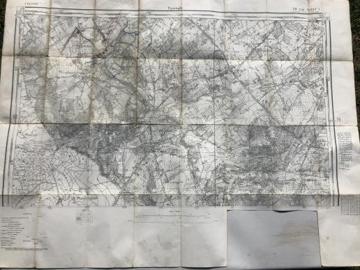 An early British trench map, 1915 dated, 1;10,000, 28 S.W. Sheet 1 Poperinghe showing the area south of the Ypres Salient down to Kemmel. Typical of these early maps, this example was a reprint of existing French and Belgian editions lacking the printed positions etc of later maps. This example has various contemporary pencil annotations that appear to indicate trenches, positions, etc. Good, used condition with various marks etc and one section of the border having been cut out.