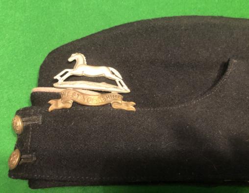 WW2 Period O/R's coloured field service cap for the West Yorkshire Regt. Dark blue with buff piping and crown. Wool body, heavy cotton lining with a plush headband with a bi metal West Yorkshire cap badge. Size 7 indicated by paper label.Little used condition, largely moth moth free with the exception of some very minor ' nips ' to piping.