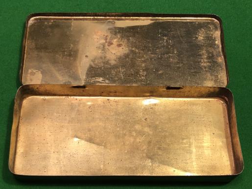 WW1 Colonies Chocolate Gift Tin. In October 1914, Trinidadian authorities, as part of their War effort, voted to spend £40,820 on cocoa, to be used in chocolate manufacturing in England.Along with the islands of Grenada and St Lucia, Trinidad’s cocoa was used to make chocolate, which was sent as a gift in a special tin to Allied troops in France. The oblong-shaped tin was manufactured in Mansfield by Barringer Wallis & Manners Ltd. This example is in better than average, clean condition with only minor marking and wear to the printed decoration and one bruise to the side. When encountered this finish is typically rubbed or suffering from corrosion.