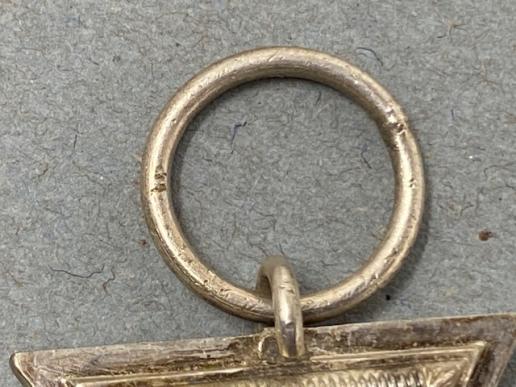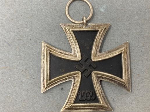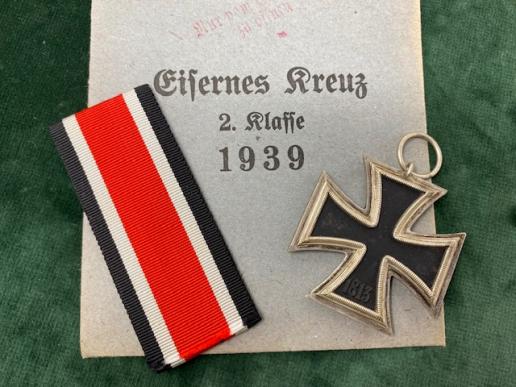 A nice example of an original Iron Cross second class in the light blue issue paper packet. This one also has a German red in stamp across the front which translates to 'only to be opened by recipient'. Cross is in mint condition with light age patina/silver toning. Original long piece of ribbon folded as issued. Cross does seem to have a maker ring stamp, but I cannot make it out.