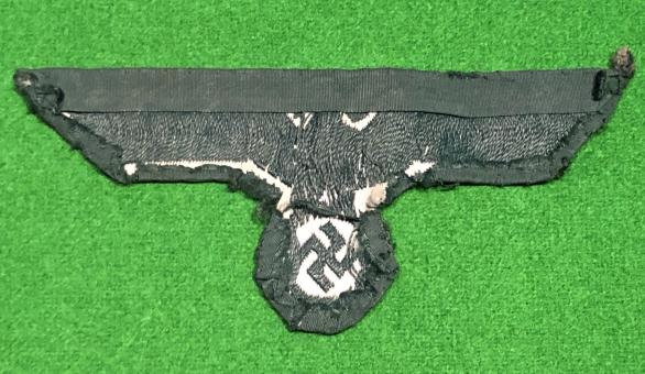 German M39 O/R's Breast Eagle. Silver grey cotton eagle on emerald green, rayon backing, using the classic Bevo weave. Good, used condition, folded to shape, slightly grubby with clear evidence of having been removed from a uniform.