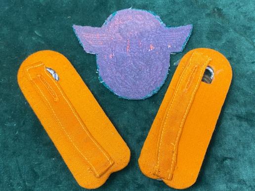 A very nice matched pair of epaulettes with orange backing for FeldGendarmerie complete with oval cloth arm eagle. In excellent condition. Epaulettes are for the police rank of Meister. Bullion and brown silk make up, with orange backings. Nice set.