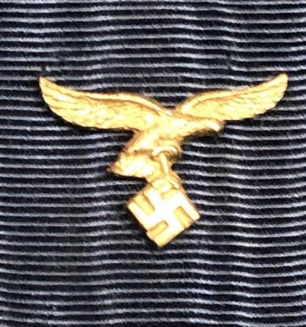Wehrmacht 4 year loyal service medal with a Luftwaffe emblem attached to the watered silk ribbon indicating issue to the Luftwaffe .Good bright condition with minor wear to highpoint of the silvered finish.