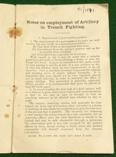1915 manual ' Notes on Employment of Artillery in Trench Fighting '.11pg with sections on ammunition, positioning and communication. Ex IWM Lib. with some annotations, rusting of staples and section missing from front cover ( not affecting contents ). Uncommon.