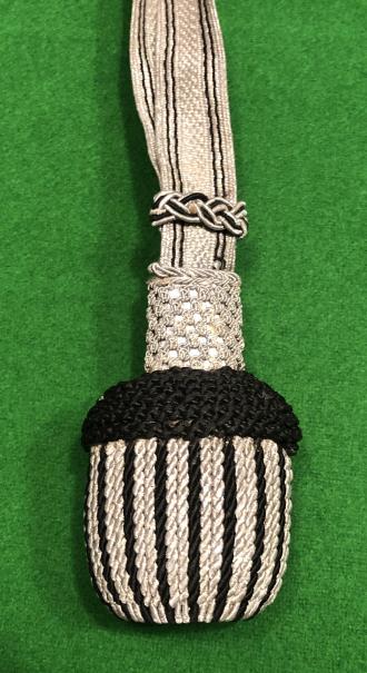 SS O/R's bayonet/sword portapee. Now generally accepted as a bayonet knot these examples are sometimes found worn with swords. Wide bullion straps with the twin black lines running up each side with the large bullion ball having alternating black and silver threads on the ball crowned with a black cap. The stem and slide have a 'zig-zag' black and silver weave. The bottom of the ball has a black centre. Excellent, used condition.