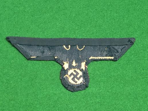 Kriegsmarine breast eagle, machine embroidered in golden thread on a green rayon backing. Initially issued to all branches of the Kriegsmarine for wear with the field grey uniform they are most associated with Kriegsmarine coastal artillery units. Good, used condition, folded to shape with evidence of having been removed from a uniform.