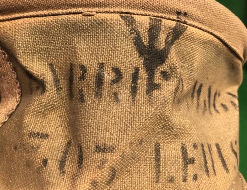 WW1 Lewis Gun magazine carrier, canvas carrier for the Lewis machine gun pan magazine. Complete with shoulder strap and twist buckle closure. Stencilled to the bottom ' CARRIER MAGAZINES 303 LEWIS GUN ' with a broad arrow. Some wear and fading.
