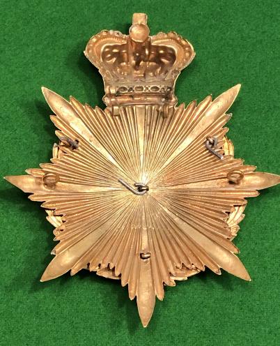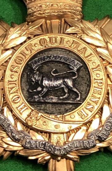 Post 1881 gilded brass, multi-piece, crowned eight point star with wreathed circlet enclosing a separate silver Tiger surmounted by ' Hindoostan ', three part scroll inscribed 'The Leicestershire Regiment', three lugs to the rear. Superb condition with bright gilt and deeply patinated silver with faded backing. Replaced locking pins to reverse.