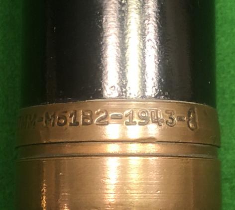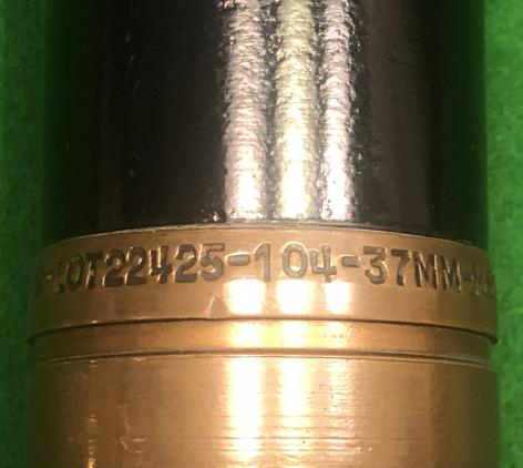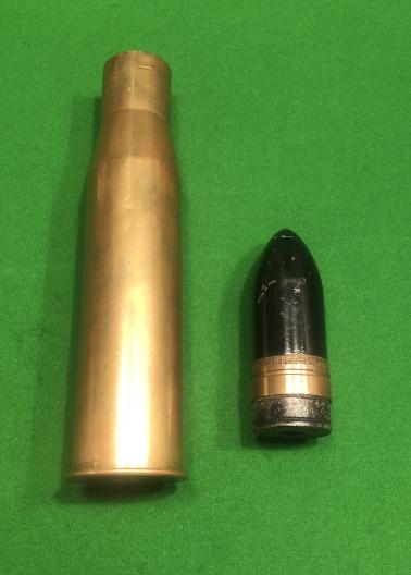 1943 dated, US 37mm M51B2 APT round. This round was intended for use in the M3 A/T gun and the same calibre gun used in various US armoured vehicles. Projectile profusely marked and dated 1943 mated to a 1942 M16 case with various manufacturer and inspection marks. Good overall condition with a small bruise to driving band.