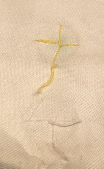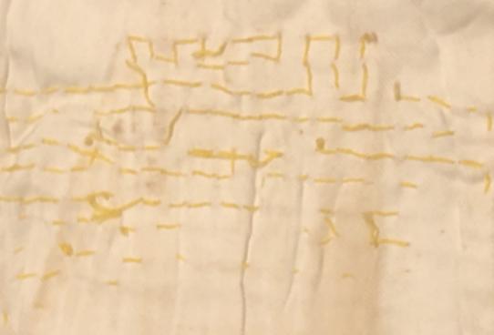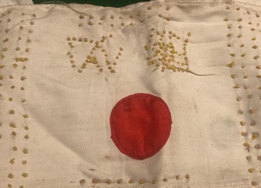 Cotton Japanese Senninbari or one thousand stitch belt. The belt was worn around the waist under the shirt or uniform as a good luck charm. The symbolic 1000 stitches are hand stitched onto the double thickness cotton belt bordering an applied silk red circle symbolising the Japanese flag. Below this are some stitched characters, probably the recipient's name. Additionally there are two coins stitched into the belt as additional good luck symbols. Displaying some signs of wear but generally in clean condition with all ties intact.