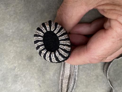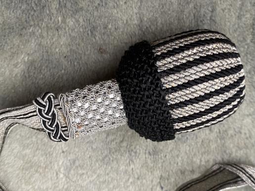 SS O/R's bayonet/sword portapee. Now generally accepted as a bayonet knot these examples are sometimes found worn with swords. Wide bullion straps with the twin black lines running up each side with the large bullion ball having alternating black and silver threads on the ball crowned with a black cap. The stem and slide have a 'zig-zag' black and silver weave. The bottom of the ball has a black centre. Excellent, used condition.