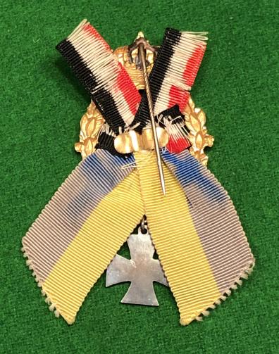 Gilt stickpin with ribbon facings for the Braunschweigisches Infanterie-Regiment Nr. 92. Featuring a crowned gilt wreath with a silver shield over crossed rifles, the shield with a skull and cross bones design. Backed by red, white and black state ribbons with the blue and yellow of Braunschweig, colours that are derived from the flag of the Duchy of Brunswick. A silvered Iron Cross is suspended from the wreath. In excellent, bright condition with some wear to ribbon.