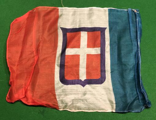 34cms x 24cms silk flag, a vertical tricolour of green, white, and red, defaced with the arms of Savoy. Obtained with a group of Axis flags and bunting ( see item 8768 ) that was discovered recently, ' unused '.