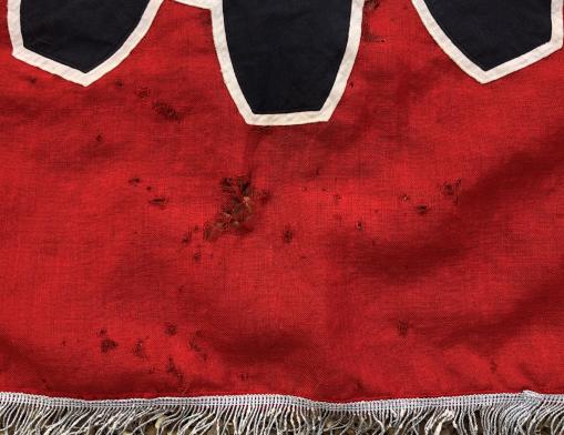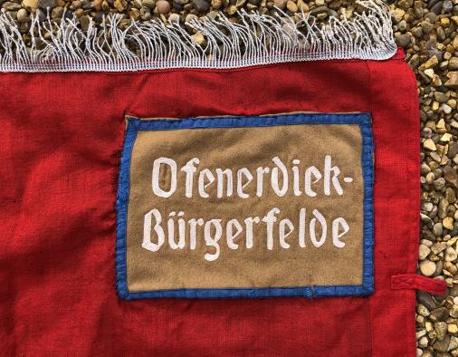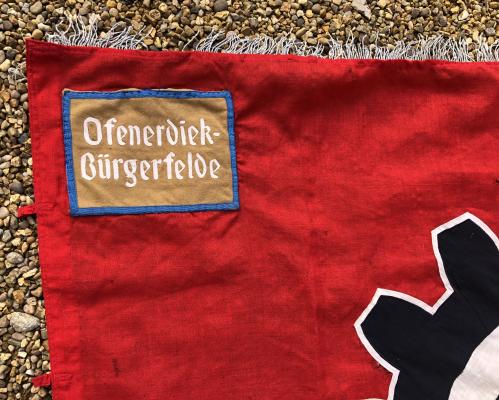 1450x1250mm double-sided Ortsgruppe banner of the Deutsche Arbeits Front. Two-piece D.A.F. emblem laid onto a red flag with silver wire brocade to three sides. To the top left corner on both sides is a multi-piece Orts panel in this case for Ofenerdiek Bergfelde near Oldenburg. Like many souvenired pieces this example has had the mounting ring attachments cut to remove the banner from a pole. There is some age related damage to various areas with some rips and holes and the brocade has dried and worn. Various parts of the banner, particularly the Orts panel and ring attachments have suffered the attentions of a seamstress with some amateurish repairs which would benefit from a more professional approach. However, all of this sounds worse than the reality,it is still an impressive banner and has been priced with the faults in mind.