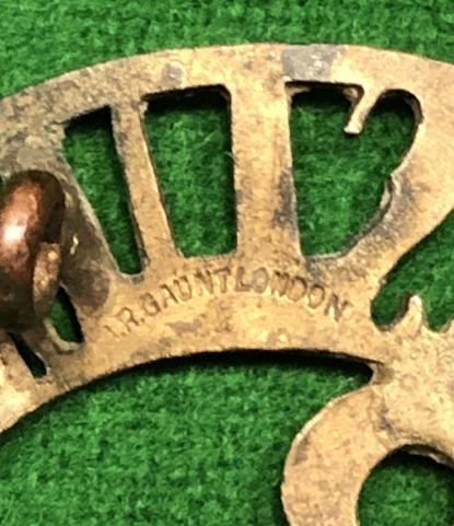 WW1 8th Territorial Battalion Notts and Derby Regiment Shoulder Title. The Battalion saw extensive service on the Western Front and during the Easter Rising in Dublin. Original brass title, maker marked ' J.R. Gaunt, London ' to the reverse with three loops. Good, used condition with some patination and slightly mis-happen.