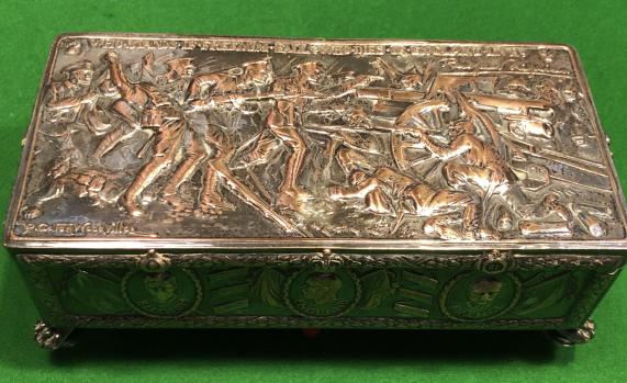 Silver plated cigarette box mounted on claw feet featuring a WW1 scene by the artist R.Caton Woodville in relief to the lid. The sides have plaques of the Allied leaders surrounded by flags and honours framed by wreaths, again all in relief. to the top of the panel of the lid is a patriotic line ' Who stands if Freedom Fall ? Who Dies if England Live ? ' taken from Kipling's 1914 poem ' For All We Have And Are '. Originally plated all over, decades of care have revealed the copper base leaving a patinated silver finish to the low points of the panels. Attractive item.