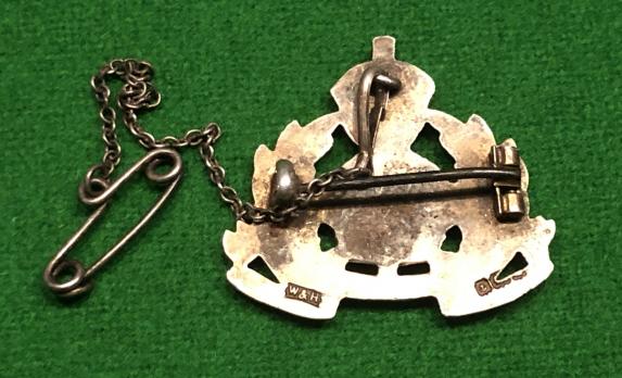 Attractive, hallmarked silver and enamel sweetheart badge for the Derbyshire Yeomanry. Pin back fitting with manufacturer's mark and Birmingham hallmark for 1941 to reverse and safety chain. Excellent, bright condition.