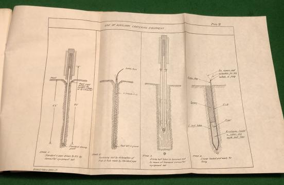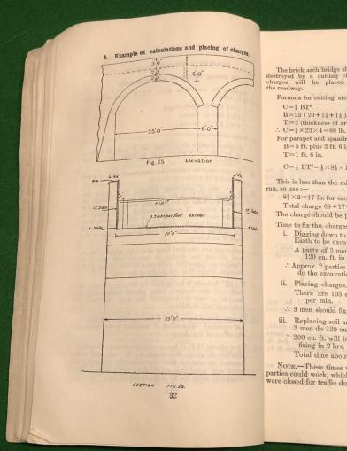 1940 Field Engineering Pamphlet No.7 ' Demolitions '. 122pgs covering all aspects of demolitions from explosives, detonators, positioning of charges and the destruction of structures, bridges etc. Illustrated throughout with diagrams, sketches and fold-out plates. Good, used condition with stained cover, rusting of staples but clean contents.