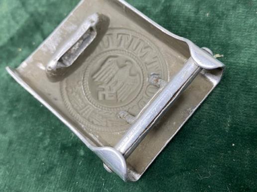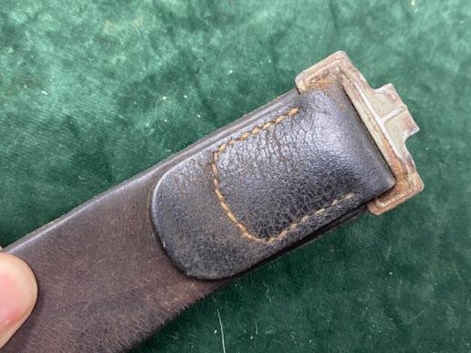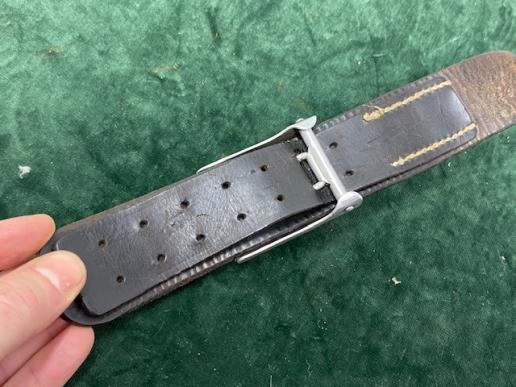 A very good example of a well used alloy Wehrmacht buckle with black leather belt with great character. Buckle has lost all of the original green paint from the face, but the reverse is all still present. Belt has the integral adjustment ‘tongue’ on the inside. Buckle has the female loop cast into the frame. A great looking combination, that have obviously ‘been there and done it!’