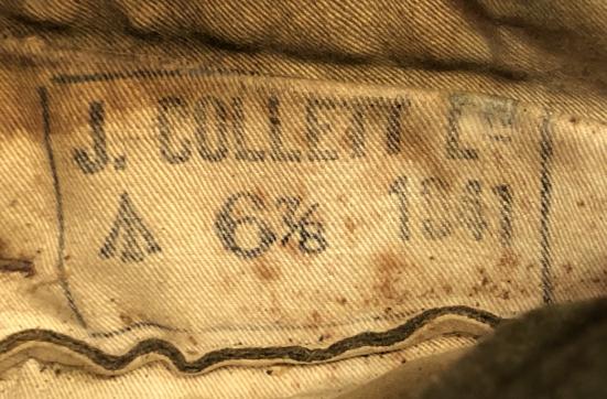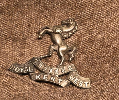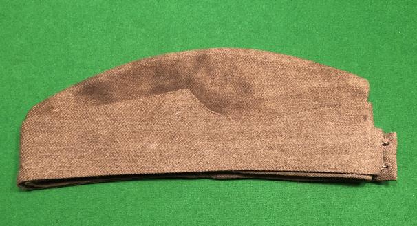 1941 dated o/r's F.S. cap for a member of the Royal West Kent Regiment. Size 6 7/8 manufactured by J.Collett Ltd with a RWK white metal cap badge. This example recently recovered from a loft and is accordingly ' salty ', clear evidence of the ' Brylcreem Boy ' owner with staining to the interior and the old soldiers' trick of keeping the crown together by use of a safety pin. Good example.
