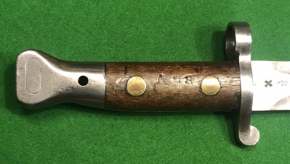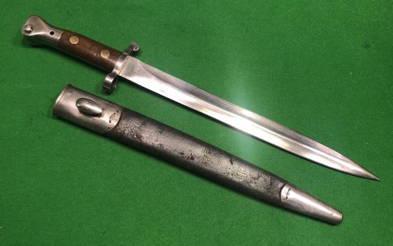 Victorian, Lee Metford, 1888 Mark II bayonet manufactured for the British .303 calibre Enfield, Lee Metford rifle. Clearly marked with Victorian crown and ' 3 and 00 ' indicating manufacture in March 1900 with a broad arrow and ' EFD ' indicating Enfield with various inspection marks to blade and grip. Also marked ' A88 ' to one grip. The bayonet is contained in a standard 1888 MK I pattern scabbard with inspection marks to leather and steel parts. Good, clean condition.