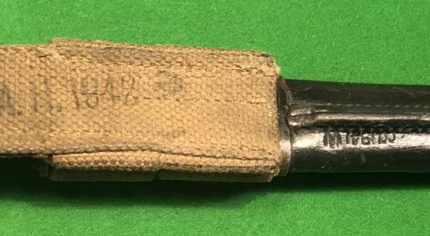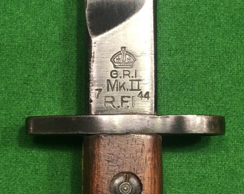 WW2, 1944 dated Indian Pattern No. 1, MK II bayonet and leather scabbard. Later version with square pommel introduced to save on machining time. The bayonet is marked on the blade with a crown over ' G.R.I. ' followed by ' MK II 7 44 ' ( July 1944 ) and R.F.I. ( Rifle Factory Ishaport ). Complete with correct 1941 dated, leather scabbard with steel mounts in a 1942 dated webbing frog. Good, clean condition.