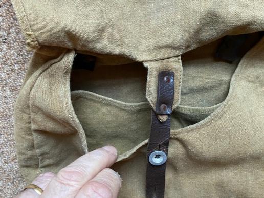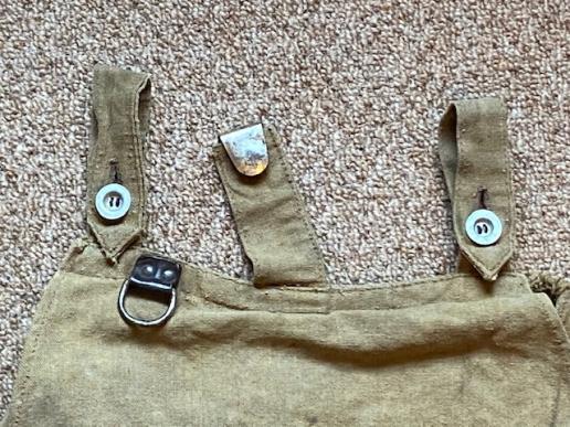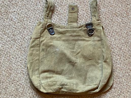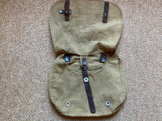 Nearly identical to ones used by the Wehrmacht, but with single D ring on the front. Nice tan canvas with no holes of damage. All belt loops and belt hooks present, all internal leather tabs and straps, all buttons present. Separate pocket inside.