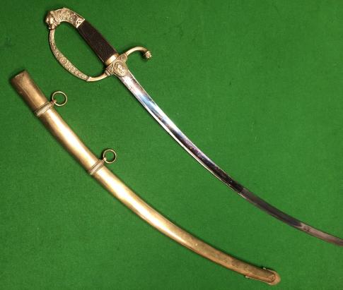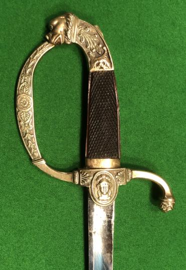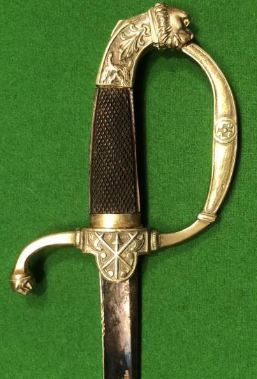 decorated plaques of crossed axes and Minerva to either side with a lion mask ended quillion. Floral decoration to knuckle bow with a lion mask and floral decorated pommel. Finely chequered dark wood grips. Contained in a brass scabbard with decorated bands supporting two loose hanging rings. Attractive item in good, clean condition.