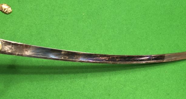 Early, probably Continental child's sword. 19" single edged, fullered blade with a slight curve and a rounded point and a blued half panel with possible residual gilding. Brass crossguard with