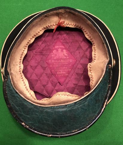 Officer's dress cap for a member of the Army Service Corps. Black body with white piping with a gilt, pre 1918 ASC badge. Patent leather peak and strap retained by ASC buttons. Interior with calf headband and quilted silk lining and prominent manufacturer's details showing maker to be ' J.B.Johnstone, London, Dublin & Lahore '.
