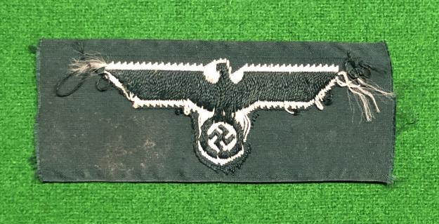 German M36 O/R's cap eagle. Silver/white cotton eagle on green, rayon backing using the classic Bevo weave. Unused, slightly grubby.