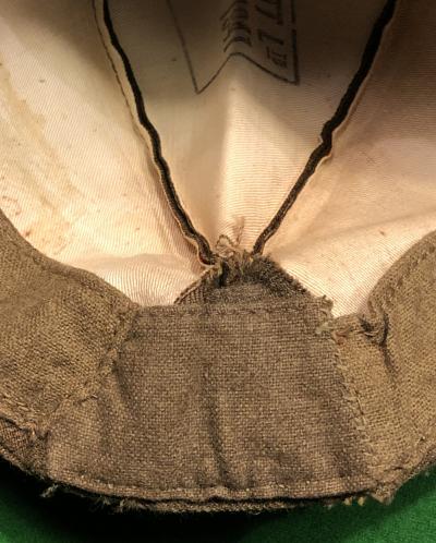 1941dated British field service cap by J.Collett Ltd, probably unissued. Originally a size 6 3/4 this cap has been officially altered to increase the size by the simple expedient of letting a section into the reverse. Now probably a size 7. Excellent, clean condition with minor foxing to interior.