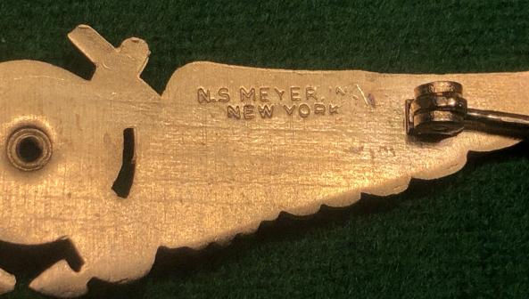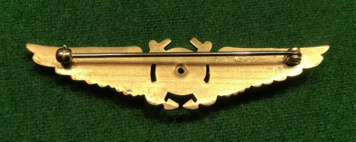 Gilt US WWII Navy Navigator Wings with a design featuring a star burst in the center with a pair of anchors in the background and flanked by a wing on each side. Roller catch pin fastening and maker marked ' N.S. Meyer New York ' to reverse. Excellent, clean condition with bright highlights.