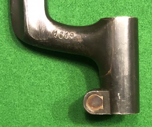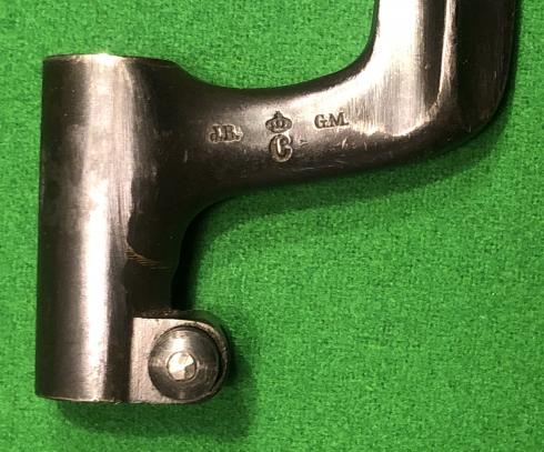 Socket bayonet for the Swedish 8mm Remington Rolling block rifle M 1867/89. Converted from M1867 stocks using the earlier model's long cruciform blade with sharp point. Shank with Swedish maker's logo: Crown over C (= Carl Gustavs, Stads Gevarsfaktori ) and two small inspector markings JB and GM, numbered 1619 to the other side. Good, clean condition.