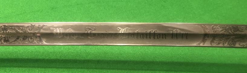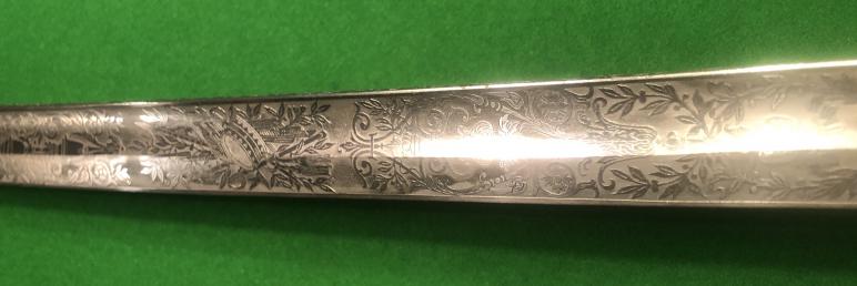 A good example of a double etched Prussian Supply Train basket hilt sword. 835mm single edged blade with fullers and foliate etch with a panel inscribed ' Westpr.Train Battalion No.17 ', etch extends to the spine of the blade. Sharkskin grips with twisted wire embellishment. Bright blade with basket hilt and scabbard in natural polish with some staining and minor pitting.