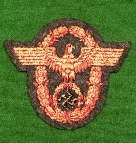 Machine embroidered NCO's sleeve eagle worn by the Feuerloschpolizei. Carmine cotton embroidered police eagle on a wreath on grey backing. Good, probably unused condition.