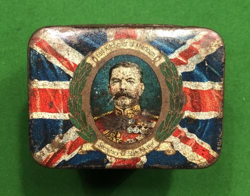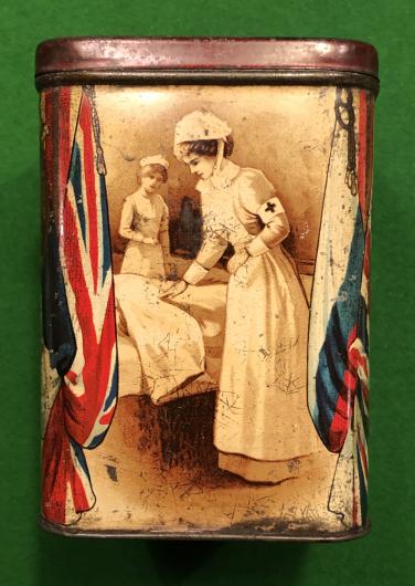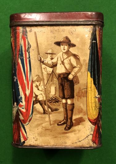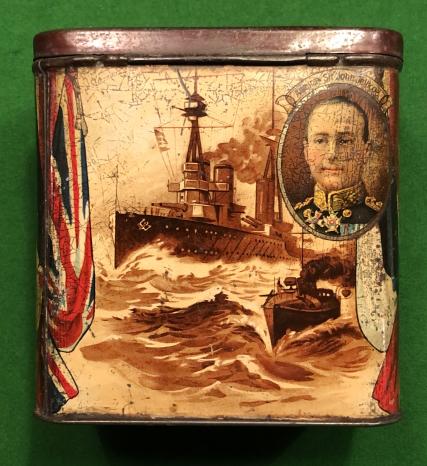 WW1 British patriotic tea tin produced by an unknown manufacturer. Colour printed to all sides and lid with notable personalities, Kitchener, Jellicoe, and French with a nurse and Boy Scout to the sides. 13cms x 12cms x 9cms, in good, used condition with some minor abrasions etc.