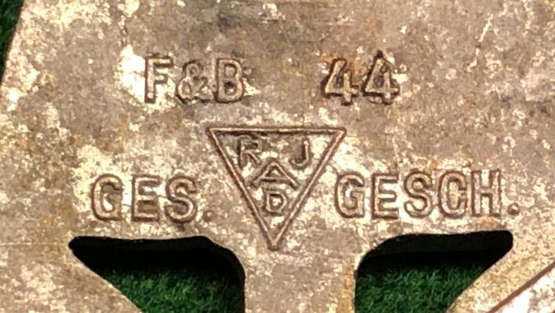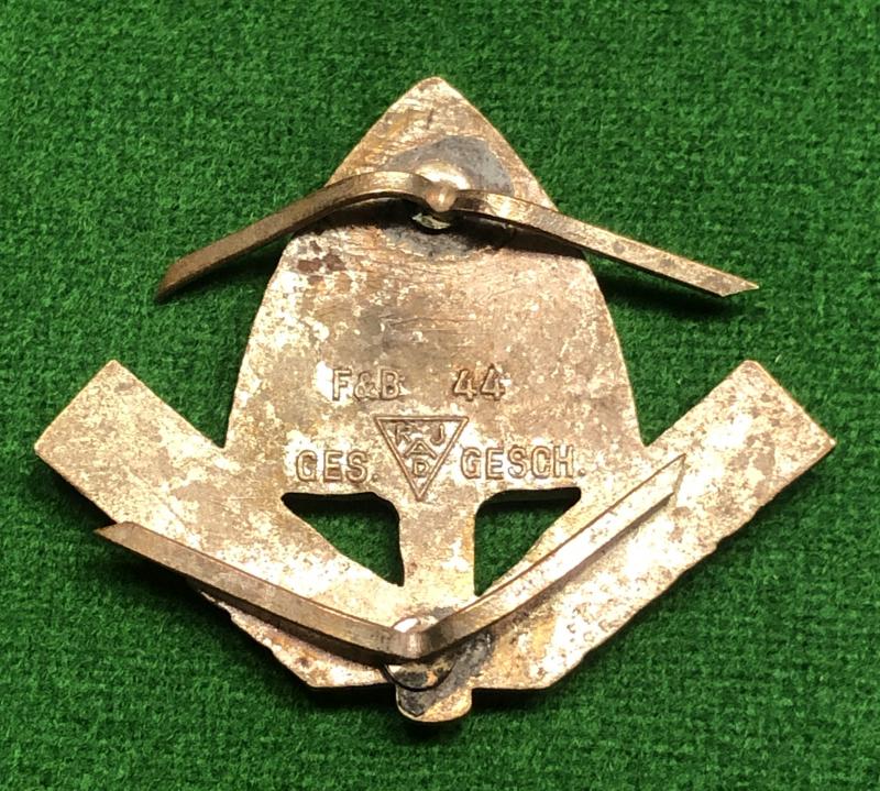 Reichs Arbeit Dienst cap device for an officer's 'Robin Hood' cap. Manufacturer marked to the reverse ' F&B 44 ' and ' GES. RJAD GESCH. Silver washed insignia with enamelled obverse. All pins intact and in good condition with some minor marking to the enamel and patination to reverse. Good, undamaged example.