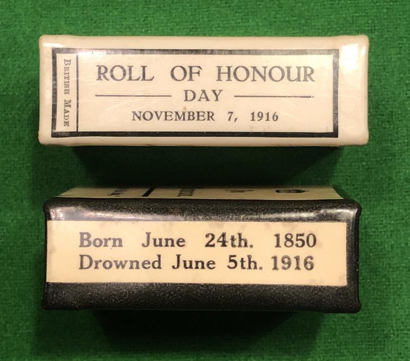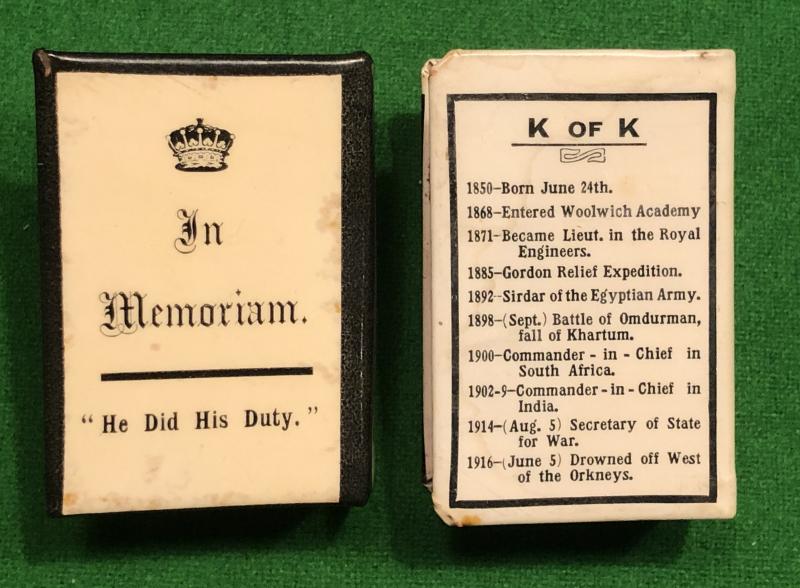 2 x memorial matchbox covers produced in memorial to Kitchener. One cover features his portrait and ' In Memoriam ' and the date of his drowning June 5th 1916 and the other a different portrait and a calendar CV to the reverse. Both covers in clean condition with some minor chips etc.