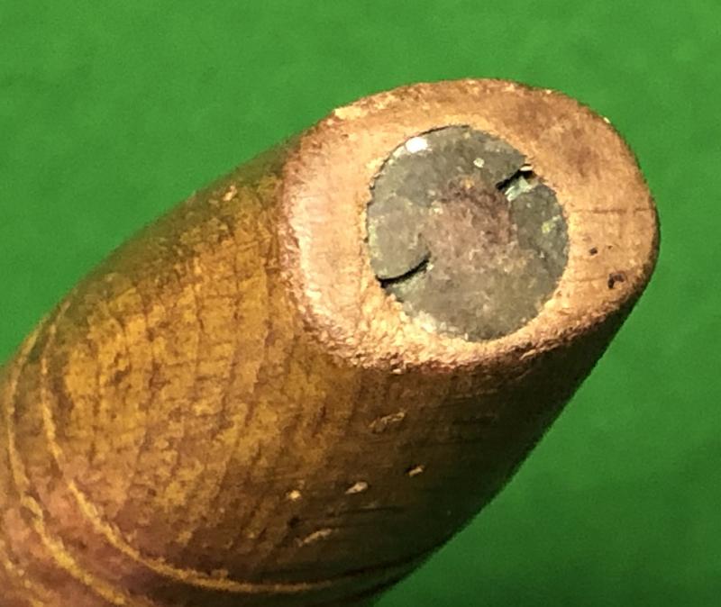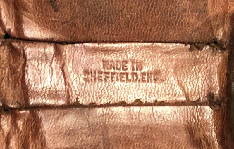 Often associated with use by the RAF and reputedly made for use in the Far East, these knives display all the attributes of a third pattern FS knife with a machine drawn blade, thick cross guard but with the steel handle replaced by wood. In this example, an oval shaped with turned rings and the pommel nut recessed into the top. Good, used condition with blade having some staining and sharpening marks. ' John Blyde ' trademark stamped to one side contained in a stitched and riveted scabbard marked ' made in Sheffield '. Grip, like most has some minor cracks and a possible name and numbers inked to reverse of scabbard. Knife and scabbard otherwise unmarked with tang retaining bolt showing no signs of being apart.