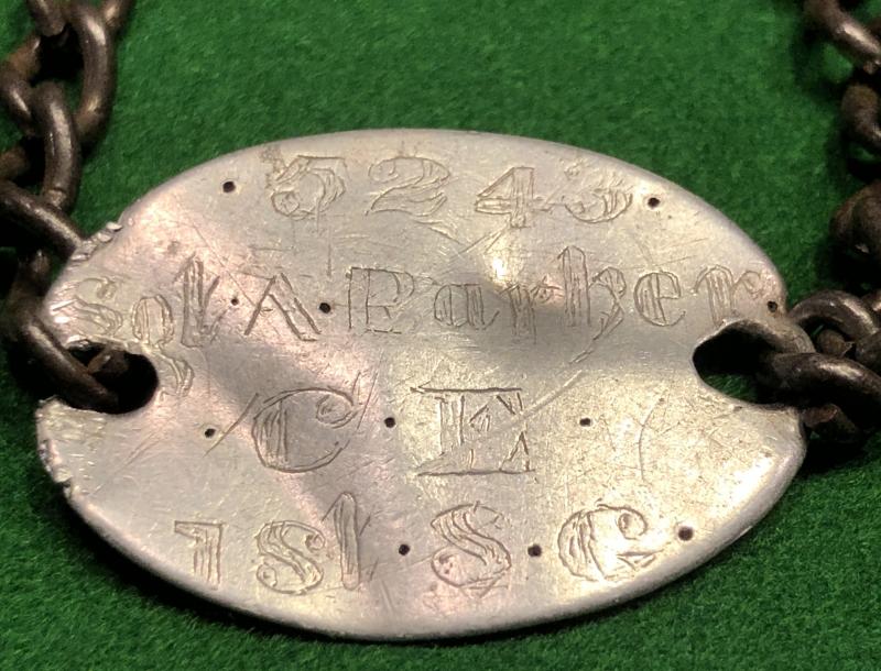 Aluminium identity tag for 5423 Sgt.A.J.Barker 1st Scots Guards. Hand engraved aluminium tag with metal link fittings for use as a bracelet. Barker it would appear was M.I.D. on 22.05.17 but further research would be beneficial. In good, used condition with one side of the tag having worn through and some bruising and creasing. Accompanied by MIC details.