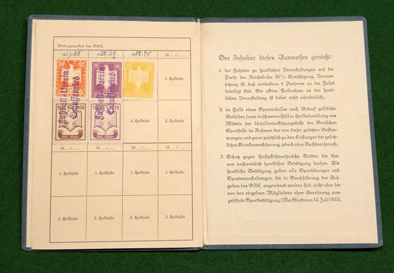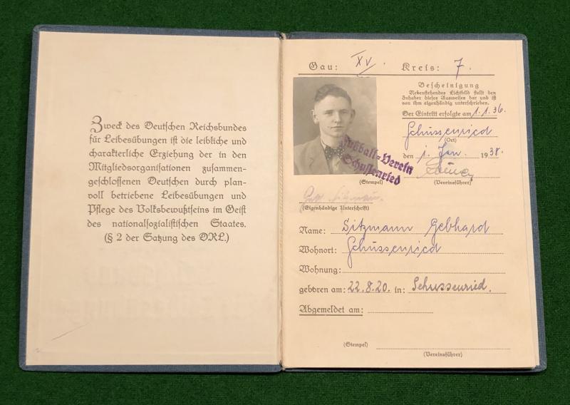 1938 membership book for the Deutscher Reichsbund fur Leibesubungen. Photograph of the owner ' Sitzmann ', who it would appear was a footballer. Complete with membership stamps and in good, used condition.