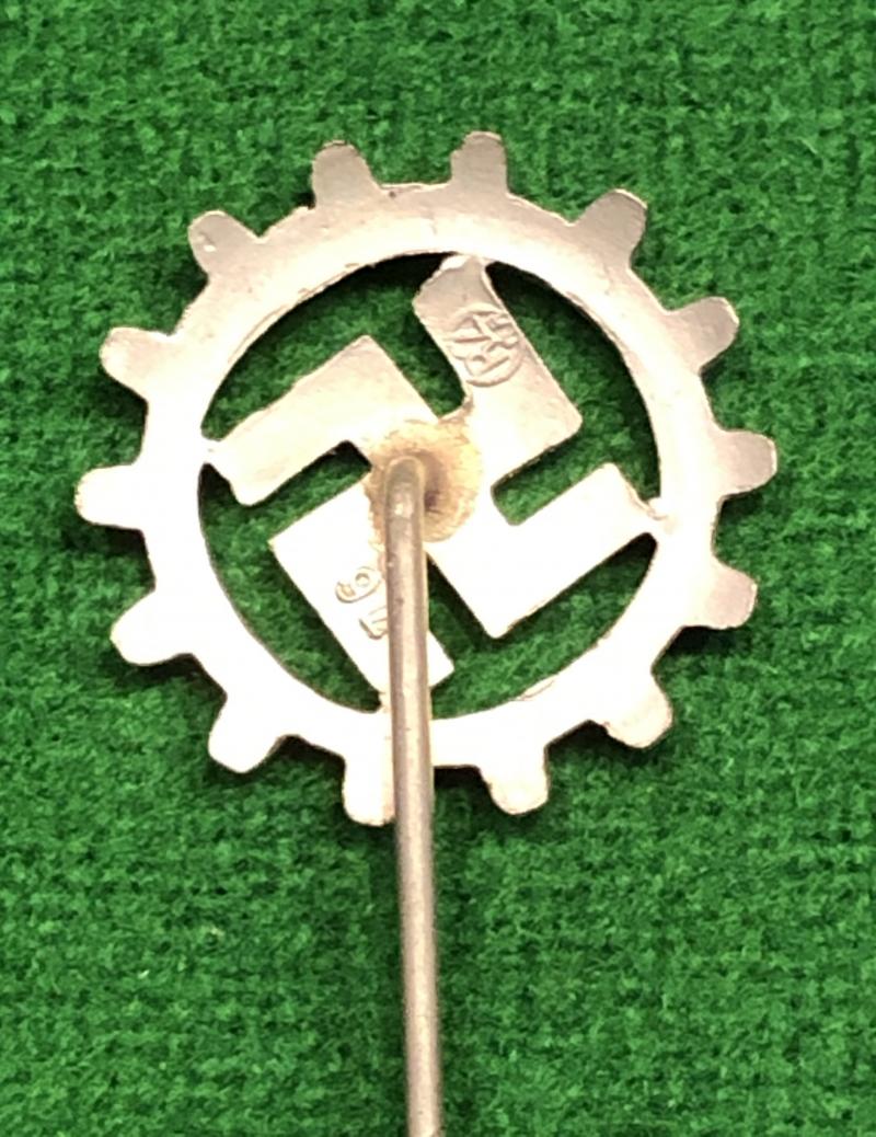 Mint condition stickpin to be worn by members of the Deutscher Arbeits Front. Manufacturer marked RZM 76 to reverse.