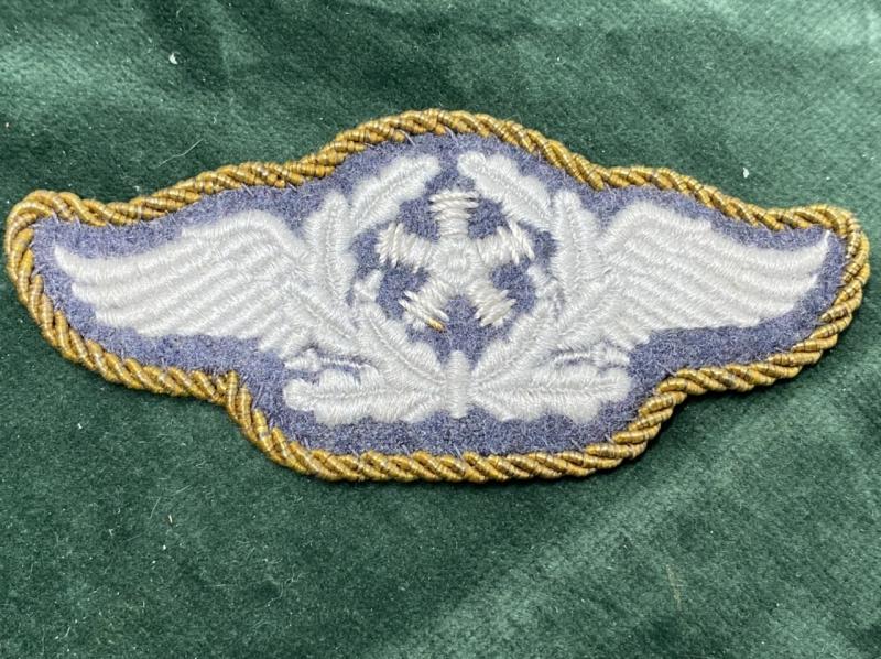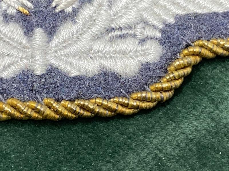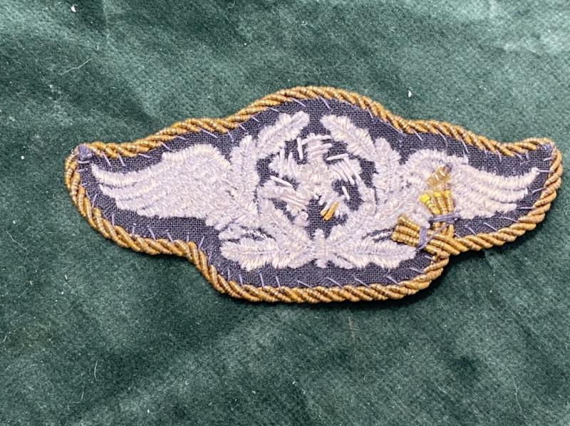 A standard Luftwaffe technicians sleeve badge, but much better quality and with tightly stitched gilt wire around the edge. Luftwaffe grey wool background with white detail to the wreath etc. Gold wire border is awarded for length of service or another award. Makes it a much rarer ‘common’ badge.