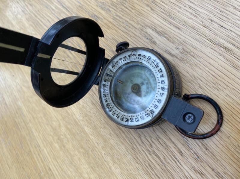 A complete and working Mk.III Marching compass dated 1940. Original black paint virtually complete. Mechanism all working and glass etc relatively clear. Compass bezel/needle free and swings easily. Top glass has the twin protector bars.