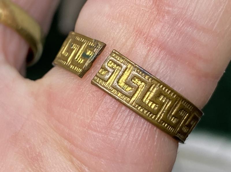 A very well made finger ring in brass and then gilded. Features a swastika in a circle and Romanesque/runic symbol engraved ring band. Fantastic detail and very fine workmanship as this is obviously all handmade. Even the arms of the swastika has accented lines running along each arm. Traces of the original gilding remain in all of the low spots.