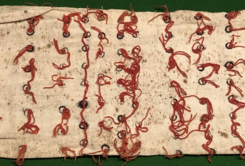 Cotton Japanese Senninbari or one thousand stitch belt. The belt was worn around the waist under the shirt or uniform as a good luck charm. The symbolic 1000 stitches are hand-stitched being circled in ink with the knots having a clear tail .The belt has been created by folding a larger piece of cotton with ties tacked to either end. Bearing clear evidence of having been worn this example is a less elaborate pattern more typical of later war patterns. Good, used condition with all ties intact.