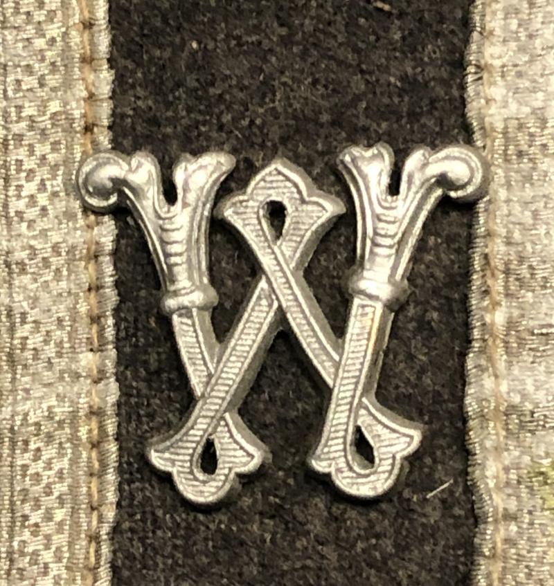 Slip-on Luftwaffe shoulder board for the rank of Unterfeldwebel with red piping for Flak troops. This particular example has the addition of a ' W ' cypher indicating an ordnance specialist. Uncommon.