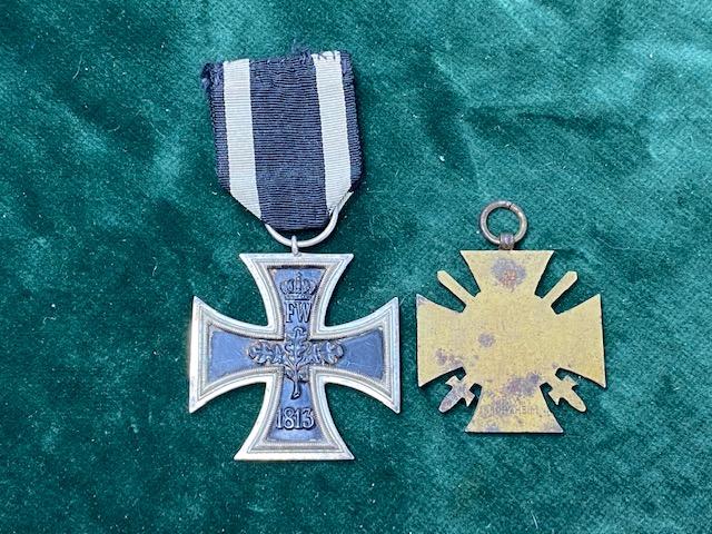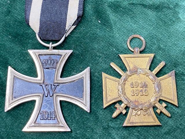 A nice pair relating to WW1. A lovely conditioned WW1 Iron cross second class, with the 14/18 Cross of Honour. Iron cross is nicely toned and in great condition with ribbon. As far as I can see it is unmarked. The Honor cross is missing the ribbon, but is maker marked on the reverse.