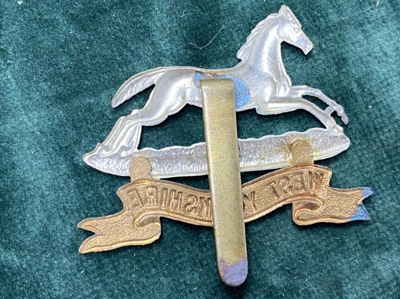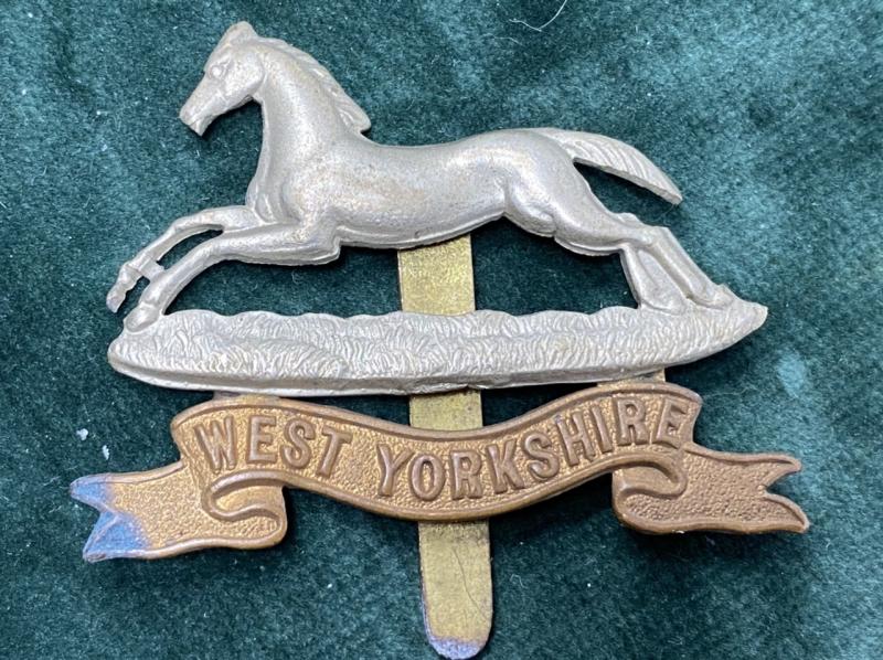 A nice, untouched cap badge for the West Yorkshire’s. Silver-brass bourse with brass scroll underneath, solid rear pin.